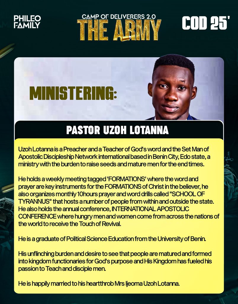 Uzoh Lotanna is a Preacher and a Teacher of God’s word and the Set Man of Apostolic Discipleship Network international based in Benin City, Edo state, a ministry with the burden to raise seeds and mature men for the end times.