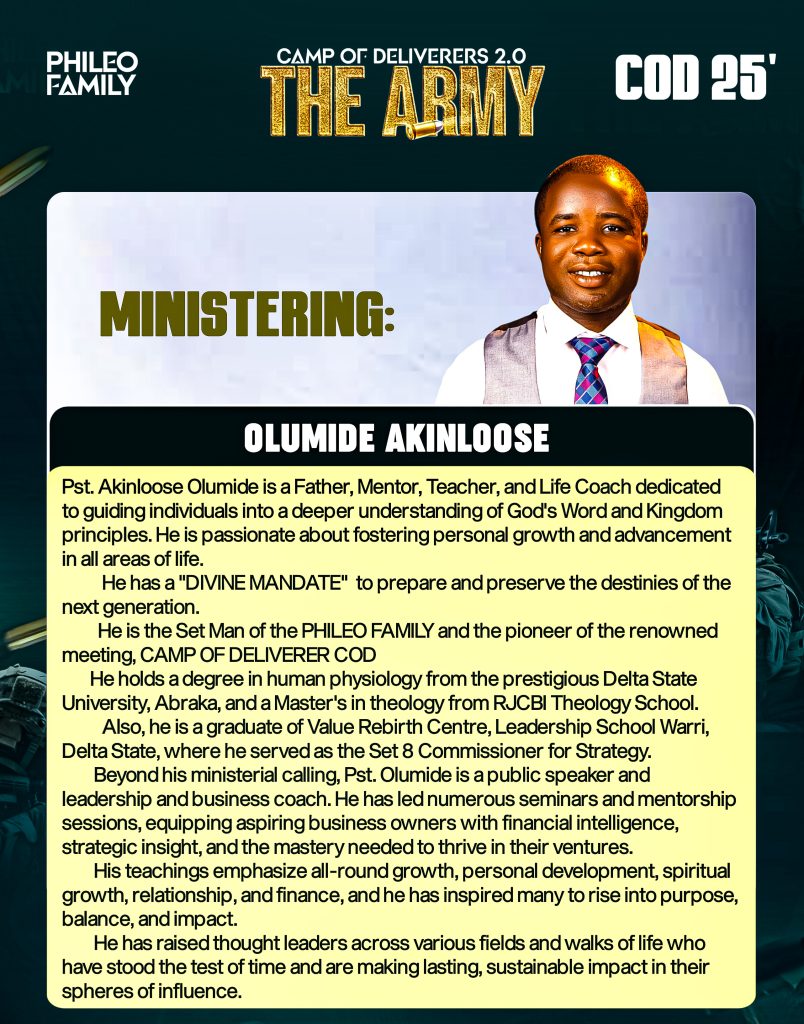 Pst. Akinloose Olumide is a Father, Mentor, Teacher, and Life Coach dedicated to guiding individuals into a deeper understanding of God’s Word and Kingdom principles. He is passionate about fostering personal growth and advancement in all areas of life.