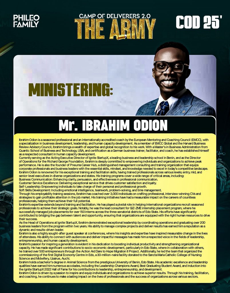 Ibrahim Odion is driven by a passion to inspire and equip individuals and organizations to achieve superior results. Through his training, facilitation, and coaching, he continues to make a lasting impact on the lives of professionals and the success of organizations across various sectors.